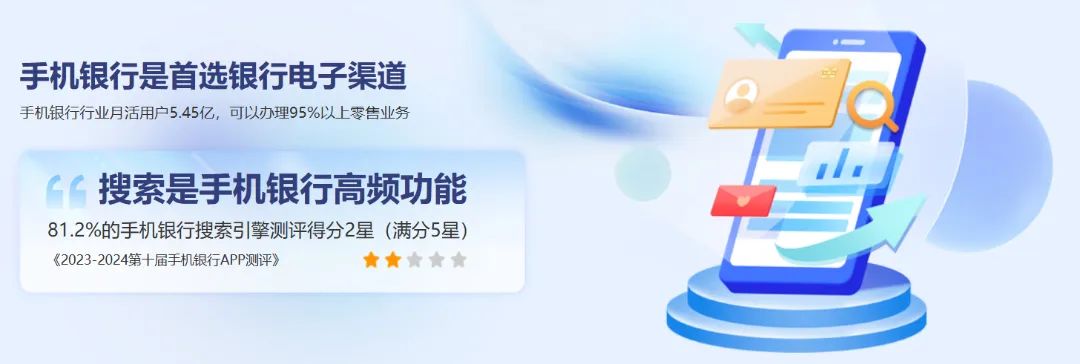 搜索是客户使用频率较高的功能,搜索体验很大程度上影响用户使用。但是根据2023-2024第十届手机银行APP测评数据显示,81.2%的手机银行搜索功能测评为2星及以下(5星为满分)。