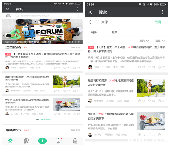4 一键发帖/发活动:本地上传图片/直接拍照上传、链接外部视频网站、上传附件、匿名发帖、投票、发布活动。