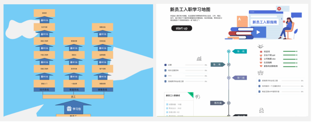 通过包含职业发展、思维导图、闯关、专题、时间轴、流程图等在内的学习地图,完成不同岗位针对性的学习资源包的学习。这些精细化培训动作和功能,让员工明确了亟需提升的能力目标,了解不同能力发展阶段的学习目标、学习内容和学习方向,完成学习任务,实现了从过去的被动学习向主动学习的转变。