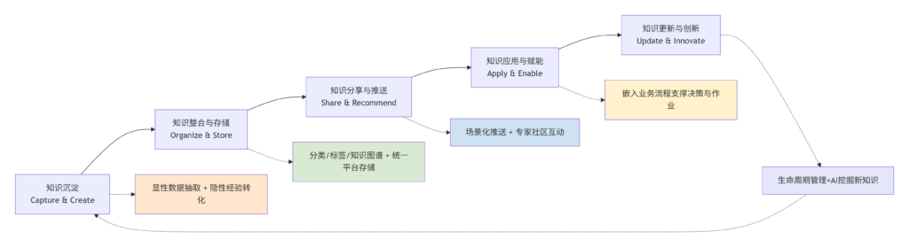 | 五级(引领级) | 生态化与自适应 | 构建产业链协同知识平台,与供应商、客户共享知识;知识系统具备自学习、自优化能力,能驱动商业模式的创新;形成知识驱动的创新生态。 |