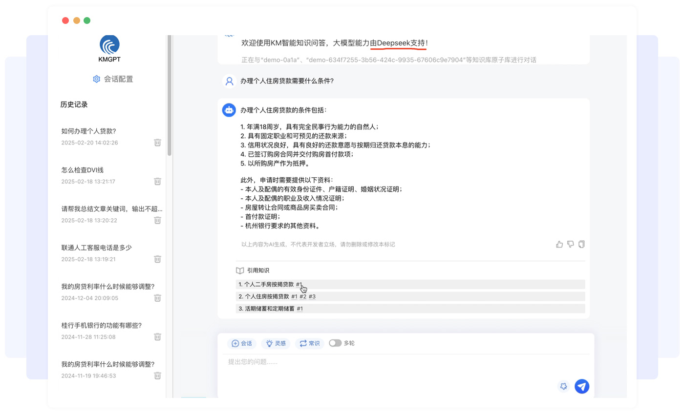 深蓝海域在此前与众多大模型对接经验的基础上,快速完成与Deepseek大模型全面对接。快速完成与Deepseek大模型全面对接。为客户构建企业级大模型知识智能提供快捷、稳健的解决方案。经过对接与技术优化,企业知识智能问答召回准确率有大幅度提升,达到生产可用状态。