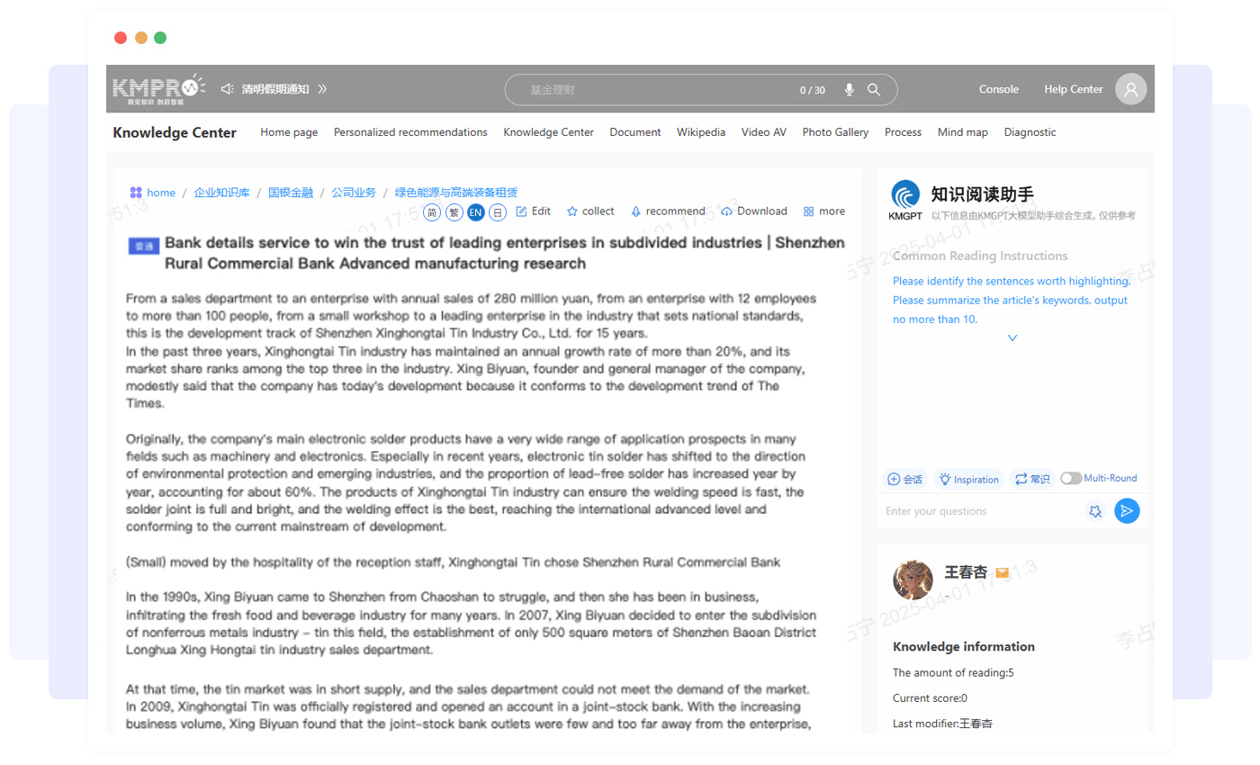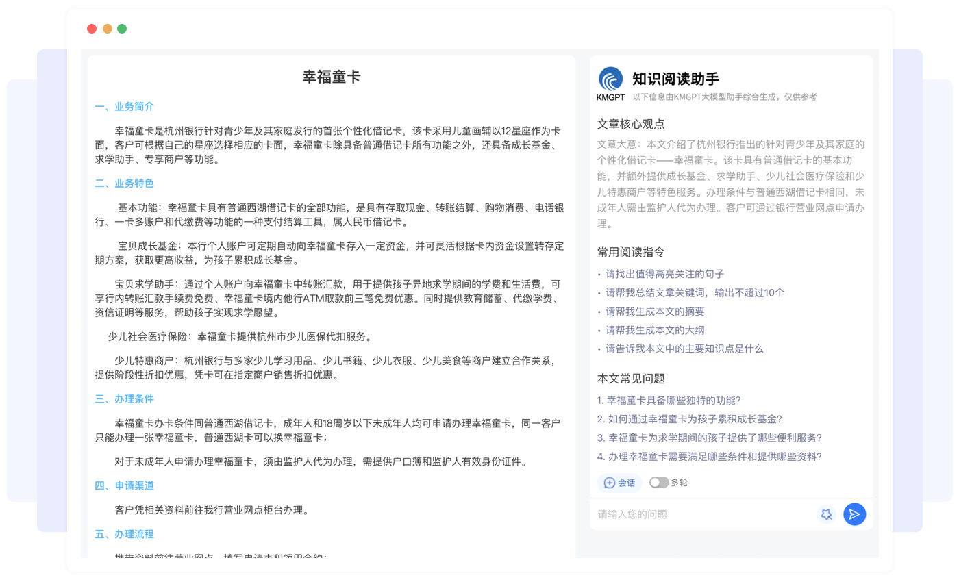 在浏览专业知识时,辅助您对长篇文档、研究报告等进行快速总结归纳,生成摘要,段落大意,以及针对本文档进行提问,大模型可快速总结生成答案。