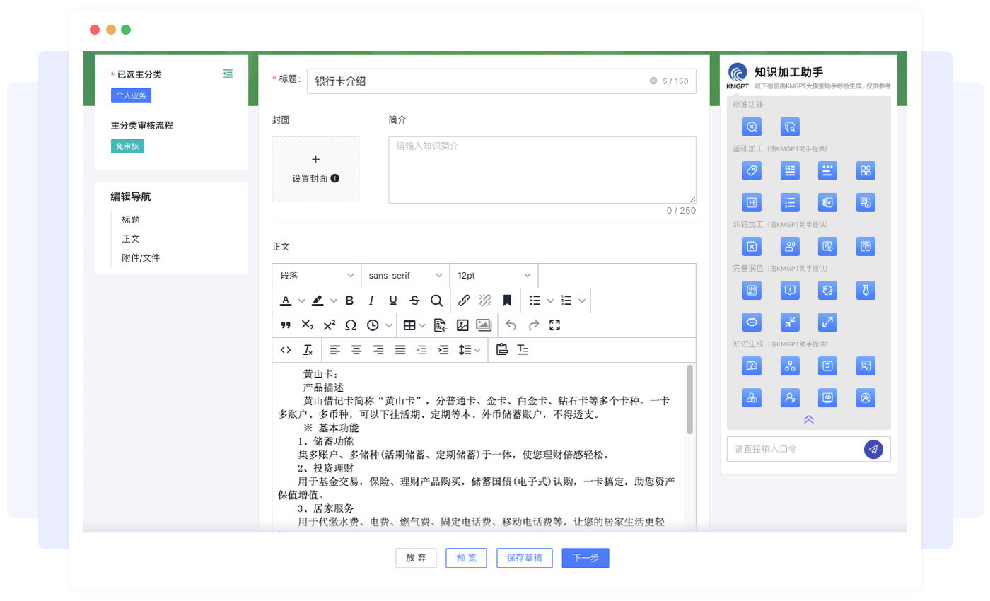 为知识编辑加工用户提供标题生成、话术生成、知识归类、提炼摘要、提取标签、生成FAQ、抽取图谱、质量检查、客户化改写、安全泄密检查、续写创作等20多项智能加工辅助。